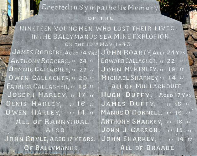 From the documentary ‘The Ballymanus Disaster’ (or ‘Tubáiste Bhaile Mhánais’), presented by Donall Mac Ruairí we obtained a personal account when Michael Hanley, an interviewee, who told his story, and we could see that the aftermath of this tragedy still resonates within him deeply to this very day. He told how he was working in Scotland and his two young brothers were down at the shore collecting seaweed when the blast ricocheted through the air. He recalled how their father ran from the house, in only his slippers as he knew instantly that something awful had happened, and was met directly with the dreadful news.